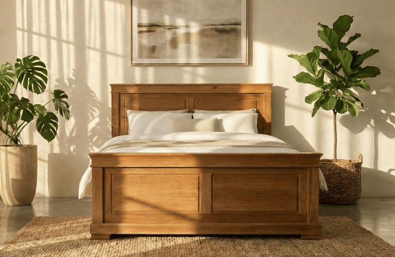 Designed with a solid headboard and matching footboard featuring clean panel detailing, this bed offers both visual balance and dependable support. The sturdy side rails and precision joinery ensure stability and noise-free performance, while all surfaces are finely sanded for a smooth touch and finished with eco-friendly protective coatings that resist moisture, minor scratches, and everyday wear.