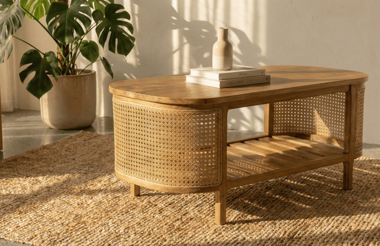 This elegant coffee table is crafted from high-quality solid wood, offering excellent strength, stability, and long-term durability. The smooth, rounded tabletop highlights the natural wood grain, creating a warm and inviting look that complements modern, Scandinavian, and tropical-inspired interiors.