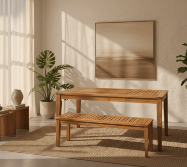 Our handcrafted wooden table and bench set is carefully constructed from high-quality, sustainably sourced timber to ensure durability, strength, and long-lasting performance. Naturally seasoned and kiln-dried, the wood maintains stability while preserving its rich grain and warm tone.